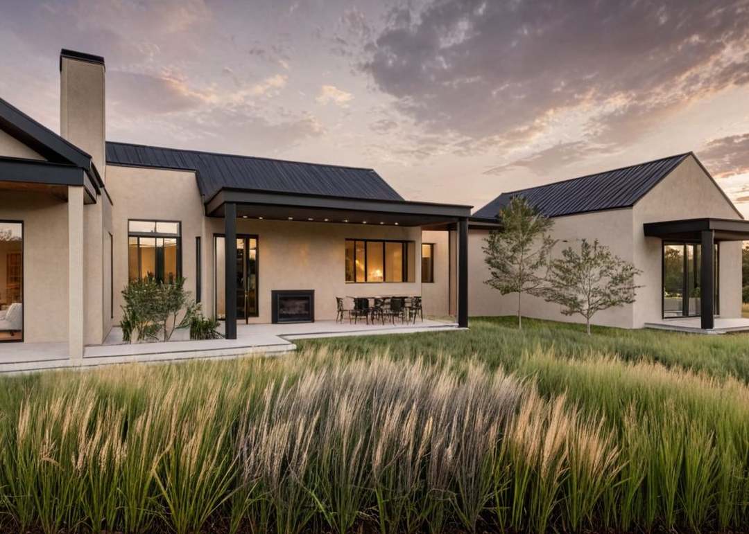 A sophisticated modern farmhouse patio with clean architectural lines, cream-colored stucco walls, and charcoal black metal roofing that frame a covered entertaining space. The design seamlessly blends indoor-outdoor living with warm-toned landscaping, recessed lighting, and a central fireplace, exemplifying contemporary desert luxury with refined minimalist aesthetics.