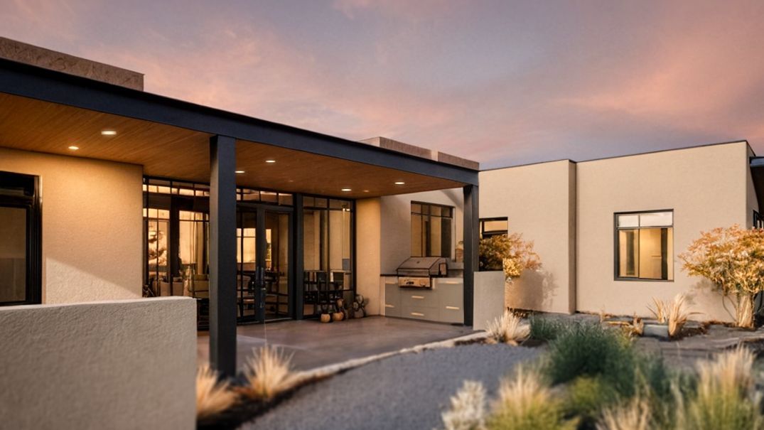 A stunning contemporary desert-modern outdoor kitchen seamlessly blends indoor comfort with alfresco dining and cooking, featuring a charcoal-gray cabinetry island with integrated grill, warm wood-plank soffit ceiling, and cream stucco walls bathed in golden hour light. The minimalist aesthetic and high-end material palette create a sophisticated yet inviting entertainment space that captures the essence of modern desert luxury living.
