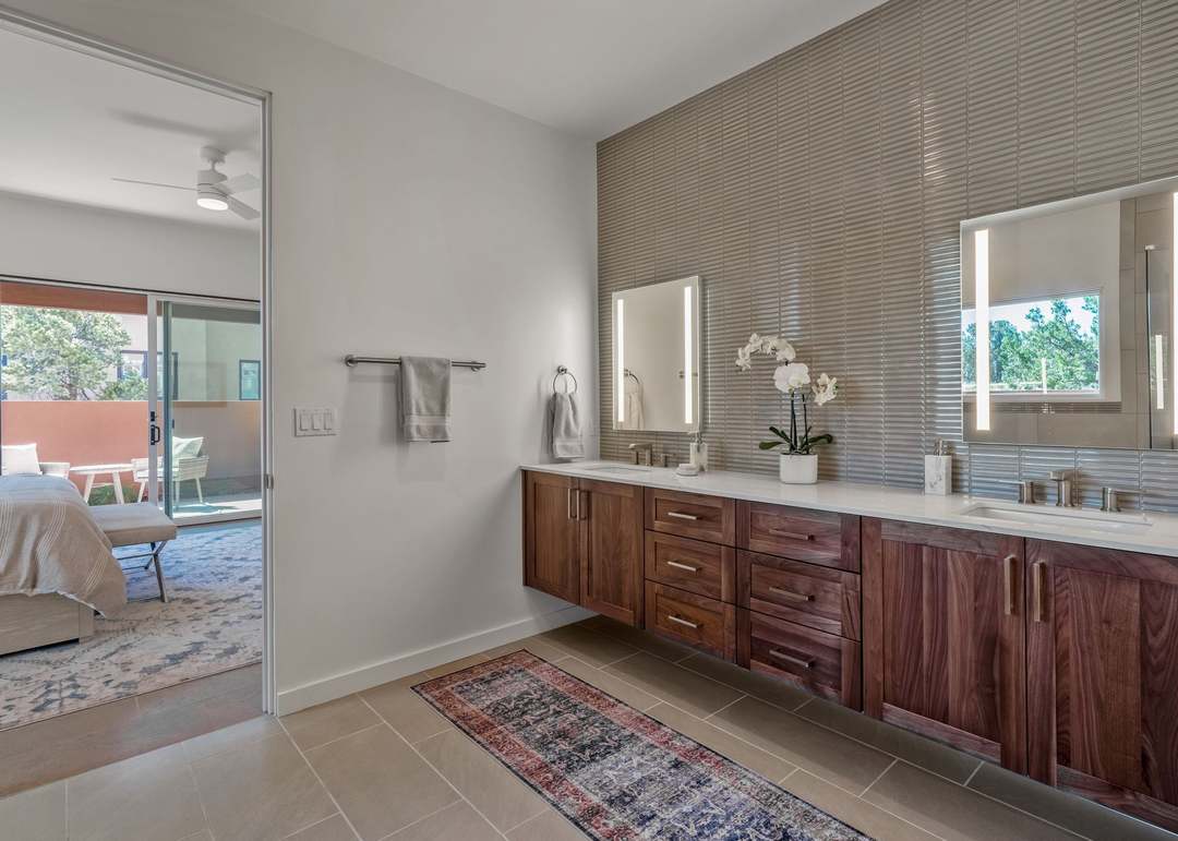 A serene, spa-like primary bathroom featuring a floating double vanity in rich dark wood with white quartz countertops and a sophisticated horizontal linear tile backsplash. The space seamlessly integrates a spacious walk-in shower with frameless glass enclosure, abundant natural light from large windows, and refined chrome fixtures, creating an airy yet luxurious retreat.