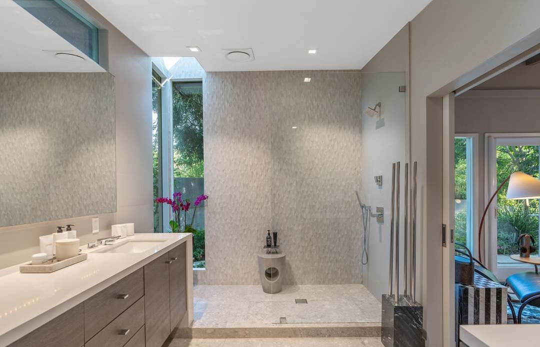 Walk In ShowerDouble VanityFloating VanitySkylightedFrameless Glass EnclosureRain HeadHigh CeilingsNatural Light From Window