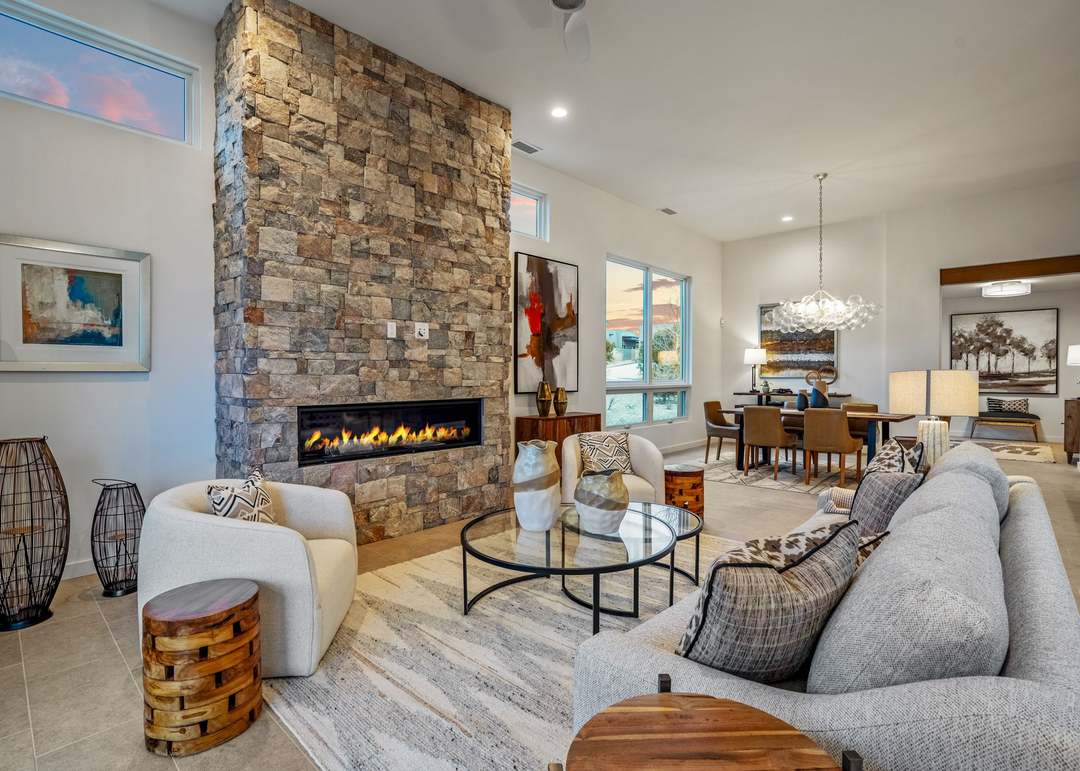 A sophisticated transitional living room anchored by a dramatic floor-to-ceiling stacked stone fireplace with a linear gas insert, seamlessly blending traditional architectural details with modern furnishings and clean-lined seating. The space features abundant natural light from floor-to-ceiling glass doors, warm hardwood flooring, soft neutral palette with gray and cream upholstery, and a sculptural crystal chandelier that adds contemporary elegance to the open-concept floor plan.