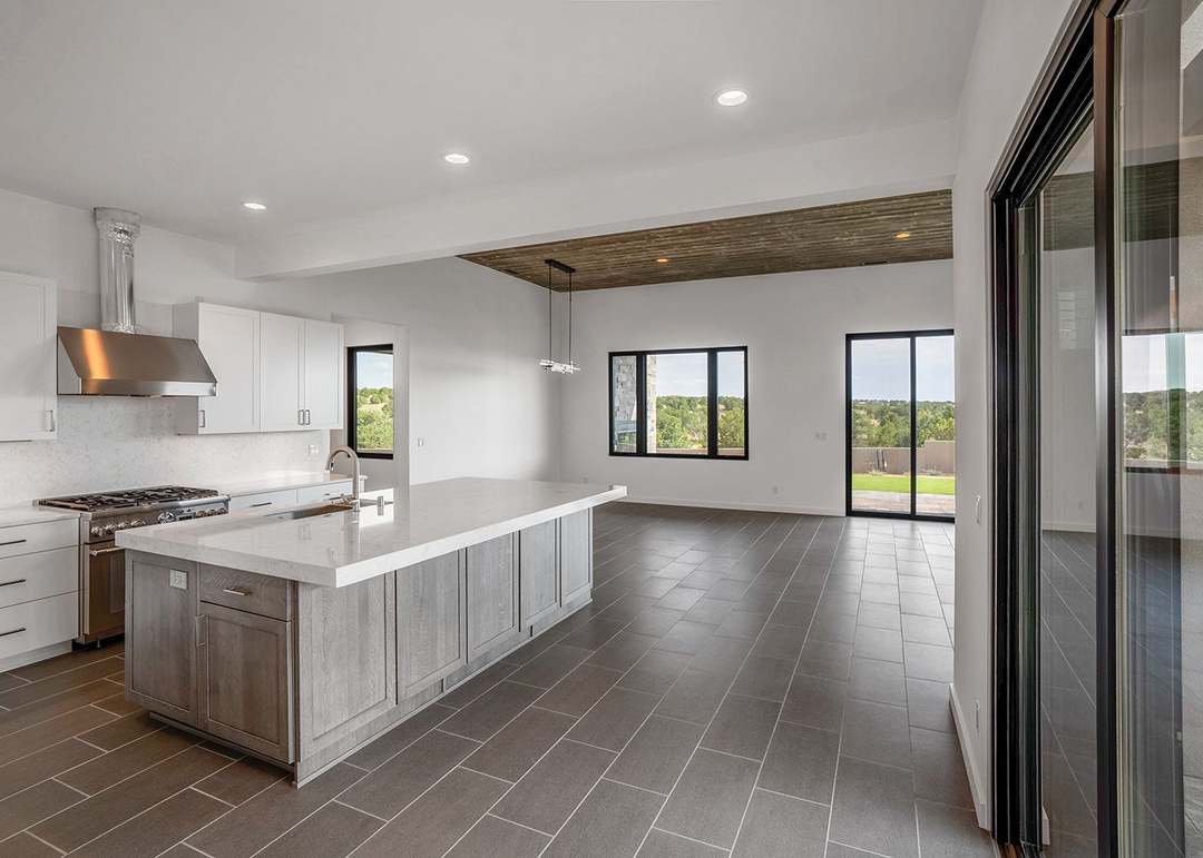 Waterfall IslandOpen ConceptRecessed LightingRange HoodFloor To Ceiling WindowsHigh CeilingsStatement PendantWood Beam SoffitGas CooktopLarge Island