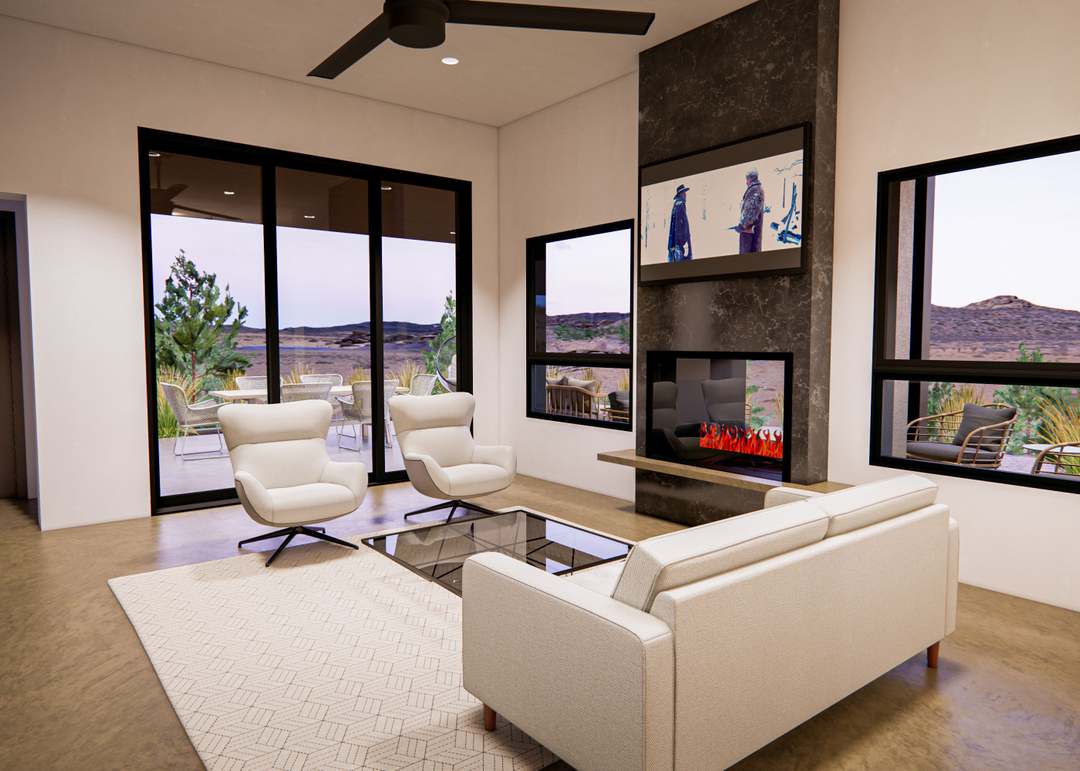 A sophisticated desert-modern living room featuring expansive floor-to-ceiling windows framing sweeping desert vistas, anchored by a striking dark stone fireplace with integrated media niche. The warm neutral palette of cream furnishings and taupe accents is elevated by contemporary furniture and statement black-frame windows, creating an airy yet luxurious retreat that seamlessly blends indoor comfort with dramatic outdoor landscape.