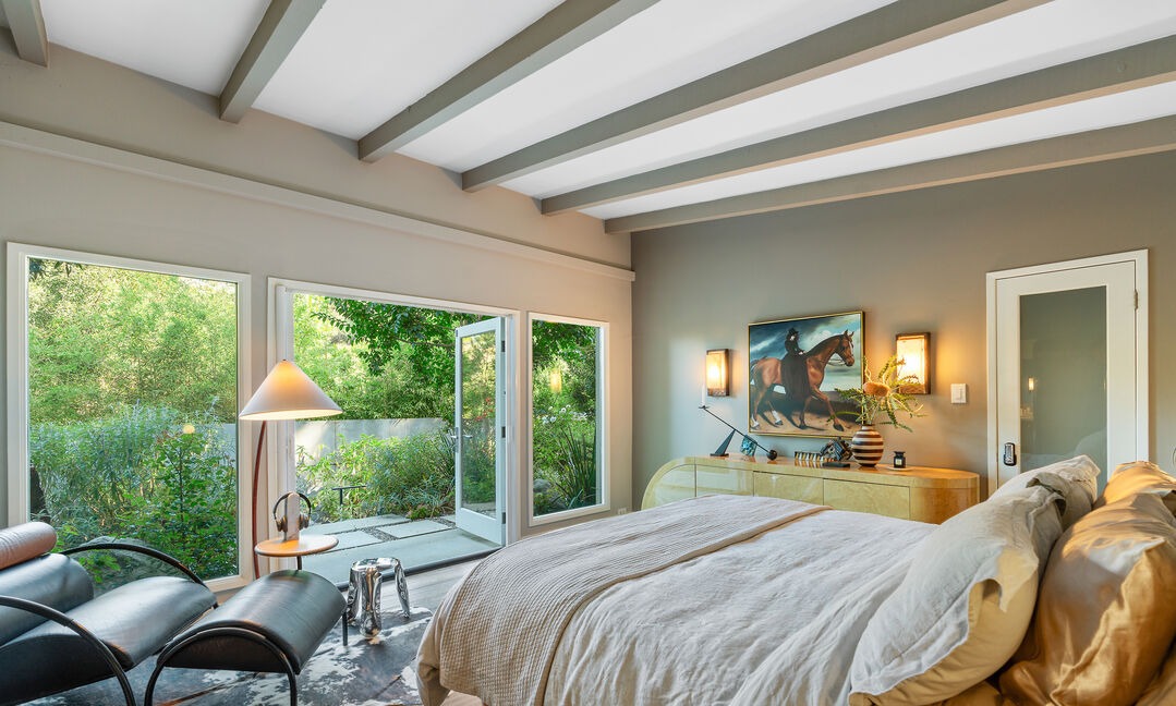A sophisticated primary bedroom suite featuring soaring exposed beam ceilings and abundant natural light through expansive sliding glass doors that frame verdant landscape views. The warm neutral palette of beige, taupe, and cream is accented with brass lighting fixtures and elevated by high-quality hardwood flooring and bespoke millwork, creating a serene, resort-like retreat that seamlessly blends transitional elegance with organic modern sensibilities.