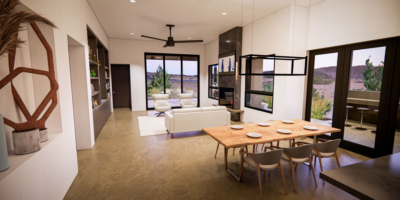 A stunning open-concept living and dining space that seamlessly integrates indoor and outdoor living through expansive black-framed windows overlooking desert landscape. The warm palette of natural wood, white upholstery, and polished concrete floors is elevated by minimalist furnishings, built-in shelving, and sophisticated black metalwork, creating a serene yet luxurious desert retreat with abundant natural light.