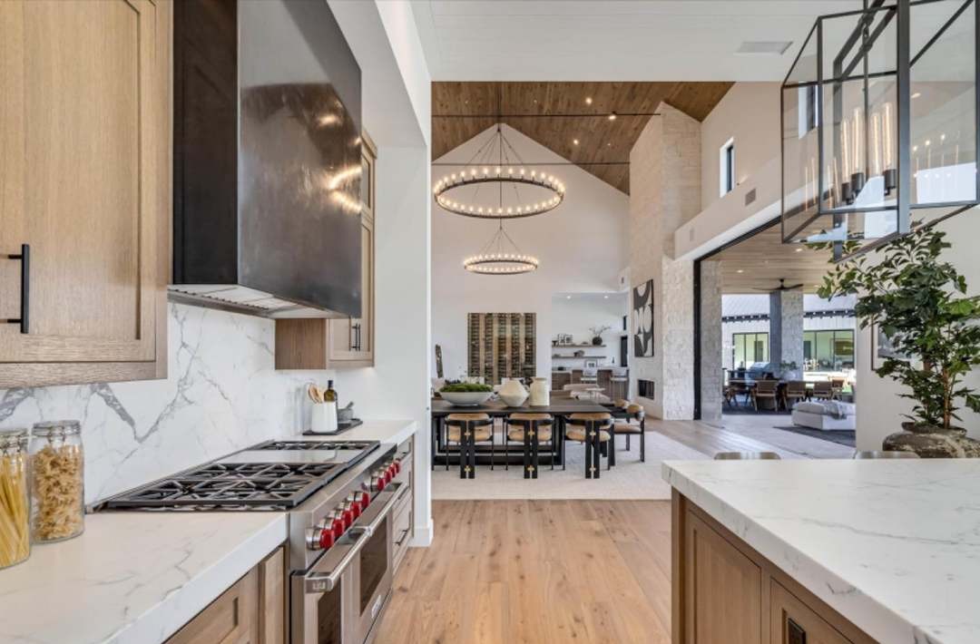 A stunning open-concept kitchen featuring a sophisticated blend of organic modern and transitional design, with light natural wood cabinetry, marble countertops and backsplash, and a dramatic vaulted ceiling with statement circular lighting. The space showcases abundant natural light, a double waterfall island, and seamless flow into a neighboring dining and living area, creating a cohesive luxury home environment.