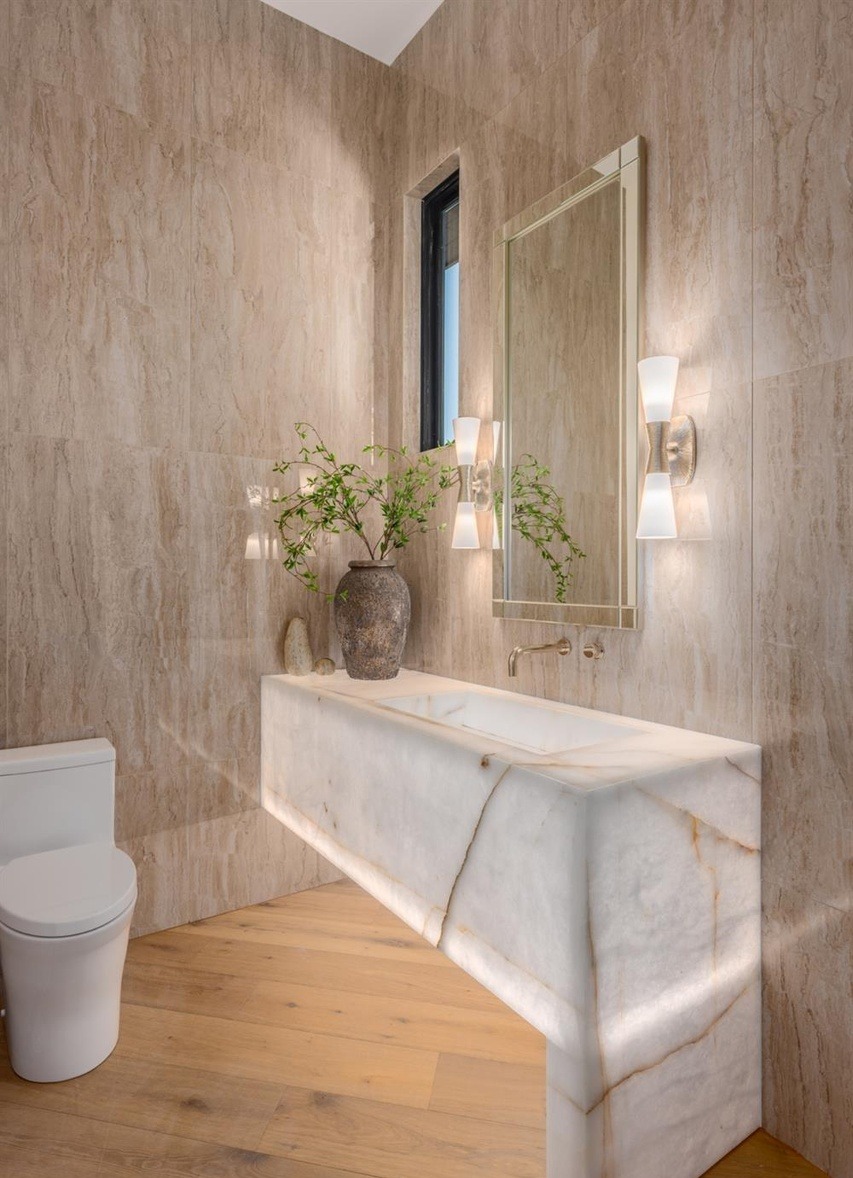 An elegant powder room featuring a sculptural white marble floating vanity with warm brass hardware and soft sconce lighting, set against textured warm-toned venetian plaster walls. The refined minimalist composition, natural wood flooring, and carefully curated botanical accent create a sophisticated and serene guest bathroom with gallery-like attention to detail.