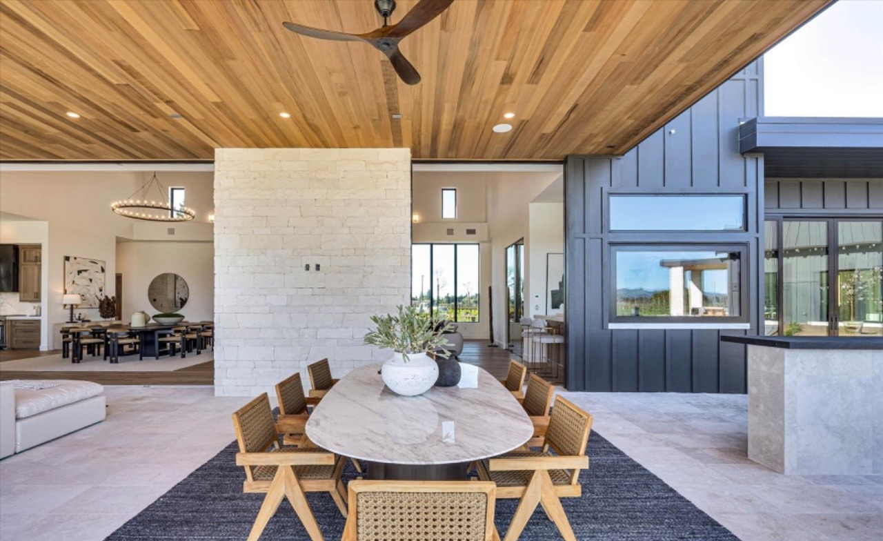 An expansive open-concept dining space featuring a sculptural white marble oval table paired with organic rattan chairs, anchored by a dramatic white brick accent wall and warm wood-plank ceiling with integrated recessed lighting. The room seamlessly integrates into a luxury home's core living areas, flooded with natural light from extensive windows overlooking mountain vistas, embodying a refined organic modern aesthetic with meticulous attention to material quality and spatial flow.