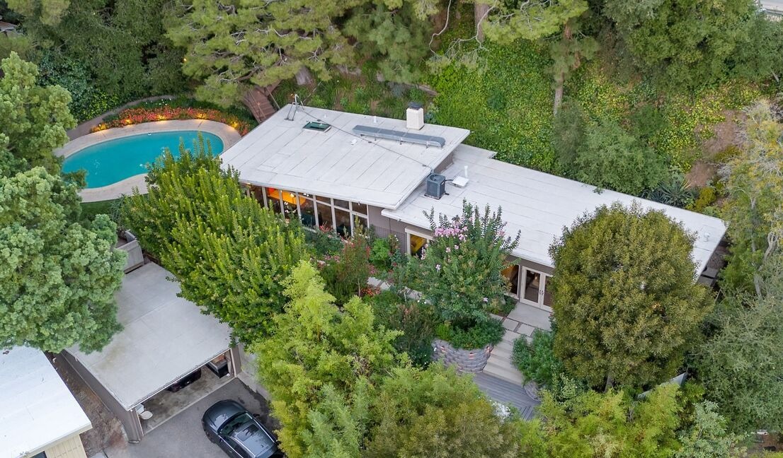 An exceptionally curated resort-style pool retreat featuring a kidney-shaped heated pool with ambient perimeter lighting, integrated fire pit, and modern flat-roofed pavilion structure seamlessly integrated into dense mature landscaping. The design exemplifies desert-modern luxury with clean geometric lines, sophisticated material restraint (white membrane roof, concrete deck, turquoise water), and professional-quality landscaping creating an intimate yet expansive outdoor sanctuary.