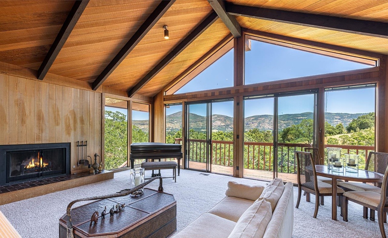 FireplaceExposed BeamsVaulted CeilingFloor To Ceiling WindowsGrand ViewsGrand PianoDeck With RailingHigh CeilingsSkylightedOpen Concept