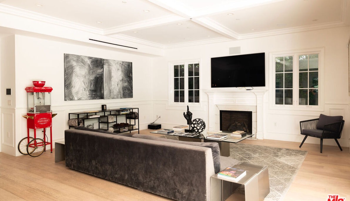 A refined transitional family room featuring a sophisticated palette of whites, creams, and charcoal accents, anchored by a fireplace and custom black metal shelving unit. The space is elevated by coffered ceiling details, wainscoting, abundant natural light from oversized paned windows, and carefully curated contemporary furnishings that balance modern minimalism with understated elegance.