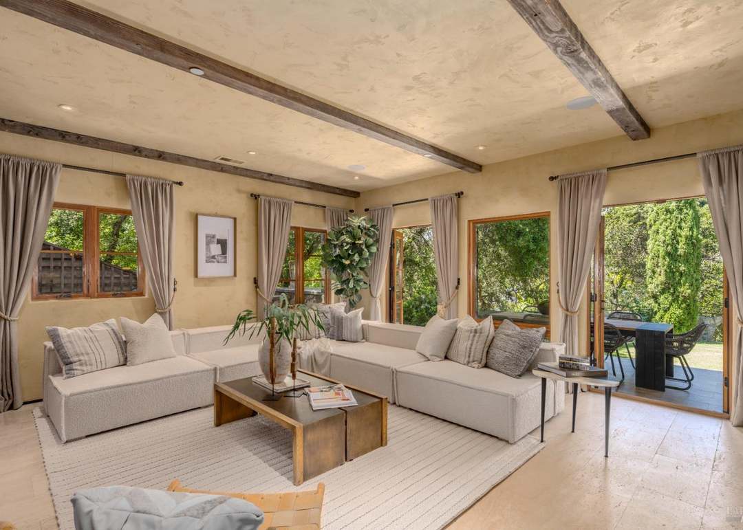 A sophisticated, light-filled living room featuring warm-toned furnishings, dramatic exposed wooden beams, and multiple sets of French doors opening onto a verdant landscape. The space exemplifies refined transitional design with traditional architectural details paired with modern, minimalist upholstery and carefully curated botanical accents.