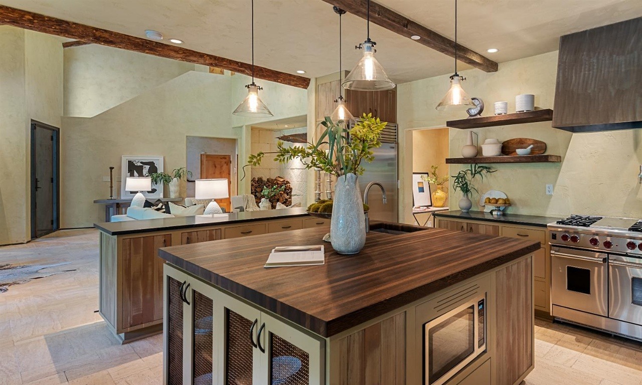 Countertop: Walnut Butcher BlockCabinets: Natural Wood ShakerCabinet Color: Natural Wood And Cream Two ToneFlooring: Hardwood With Stone TileCeiling: Beamed