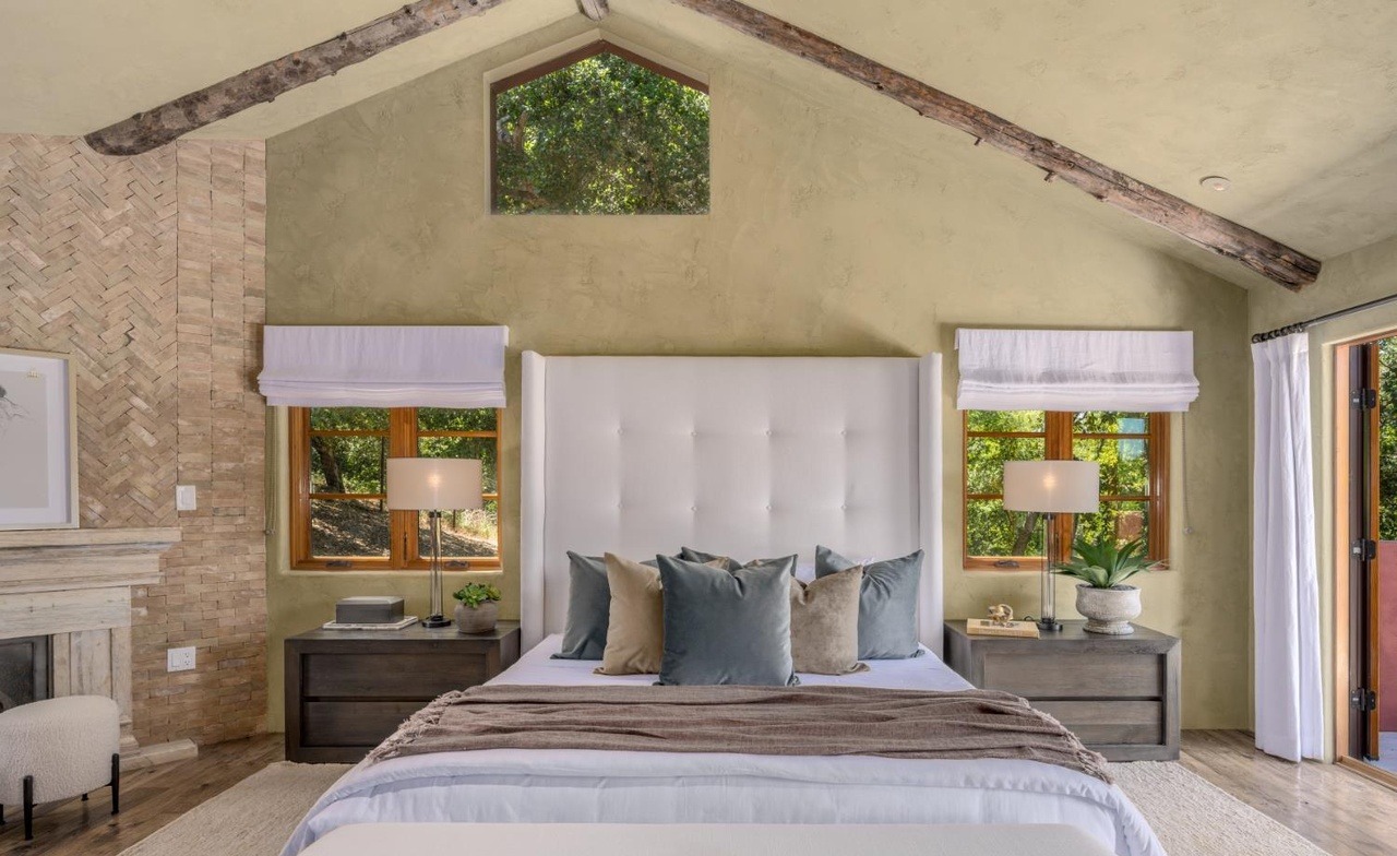 A sophisticated primary bedroom suite featuring a dramatic vaulted ceiling with exposed timber beams, abundant natural light from large transom and casement windows, and a statement tufted headboard anchoring the room. The warm neutral palette of creams and warm grays is elevated by custom nightstands, layered textiles, and a brick fireplace, creating a serene retreat that balances traditional architectural elements with contemporary furnishings and organic materials.