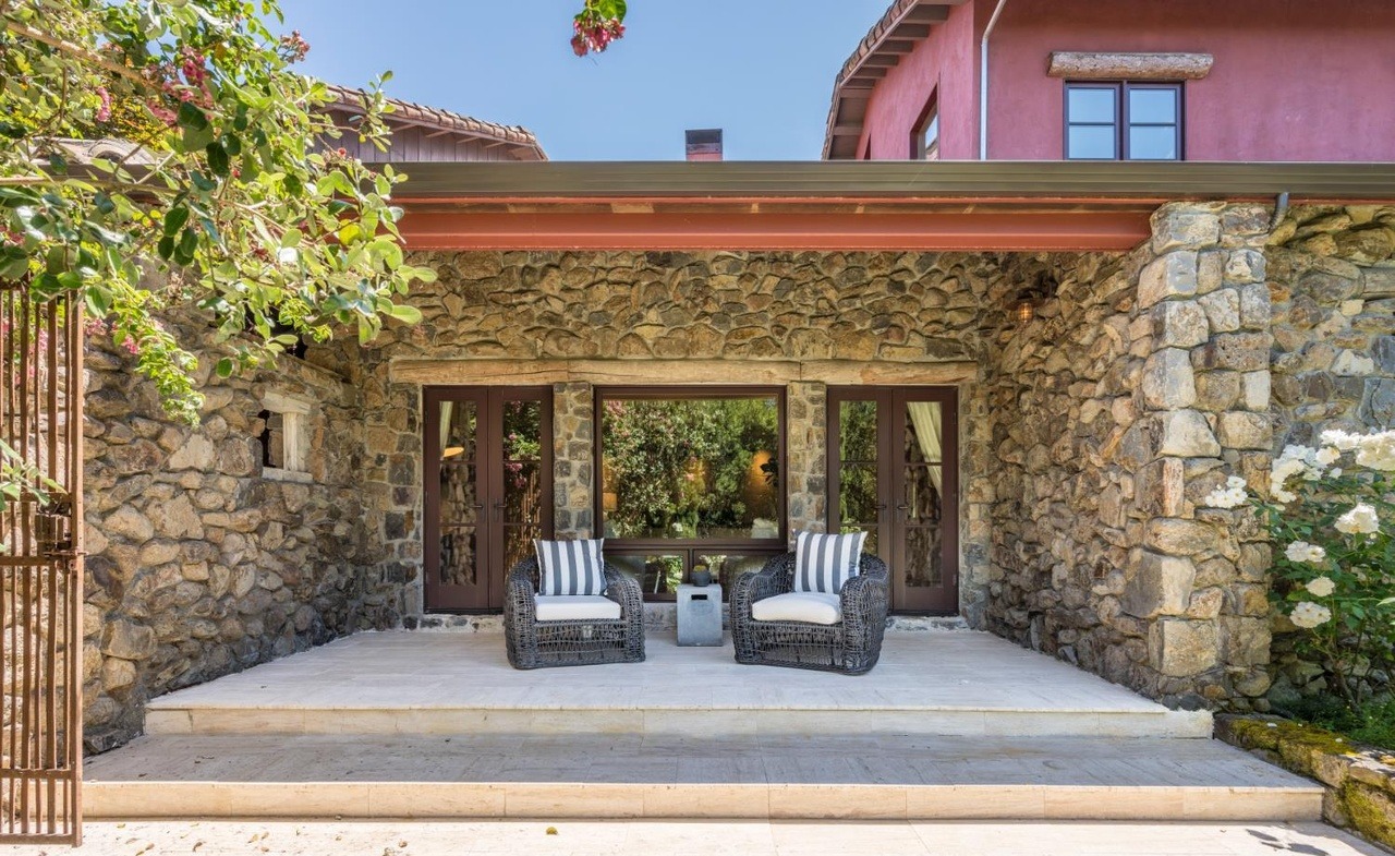 A sophisticated covered patio seamlessly blends rustic Mediterranean stone architecture with contemporary modern design, featuring warm honey-toned stone walls, clean dark-framed glass doors, and minimalist woven furniture with striped cushions that evoke relaxed luxury. The space balances raw, organic materials with sleek modern proportions, creating an inviting outdoor living area that feels both timeless and carefully curated.