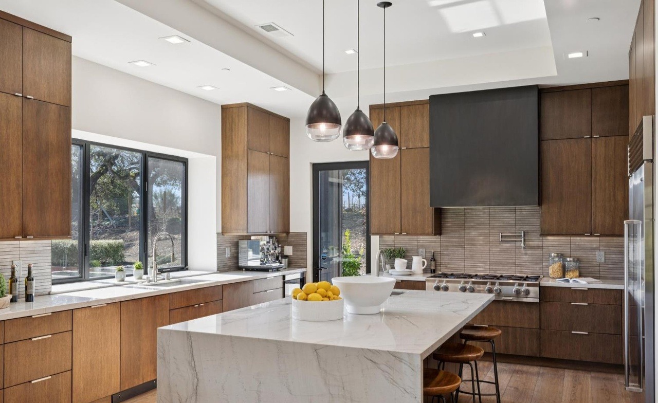 A sophisticated open-concept kitchen featuring warm walnut cabinetry paired with a striking Carrara marble waterfall island and expansive skylights that flood the space with natural light. The design elegantly blends organic materials and modern clean lines, anchored by sleek chrome fixtures, modern pendant lighting, and seamless indoor-outdoor flow through floor-to-ceiling windows.