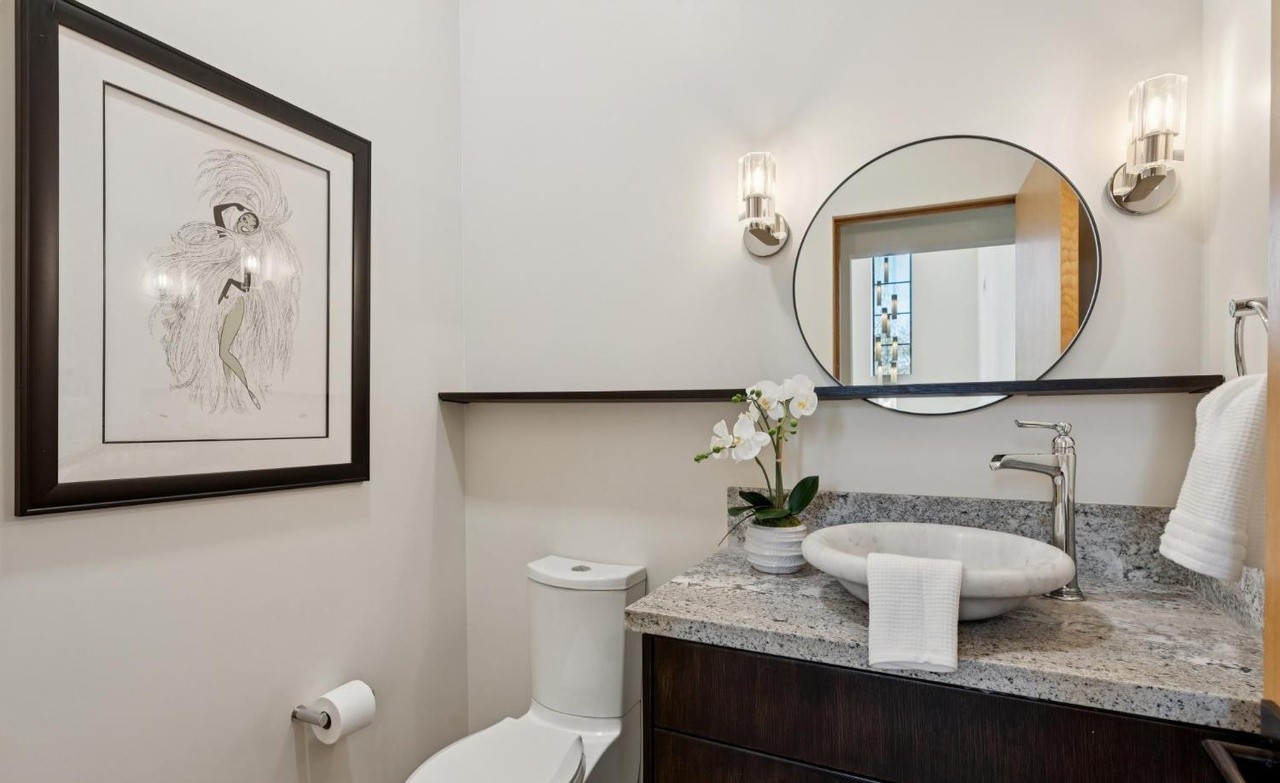 A refined powder room featuring a sleek floating black vanity with polished granite countertop, paired with a modern round mirror and minimalist vessel sink. The space balances contemporary elegance with transitional details, accented by framed botanical artwork and contemporary sconce lighting.