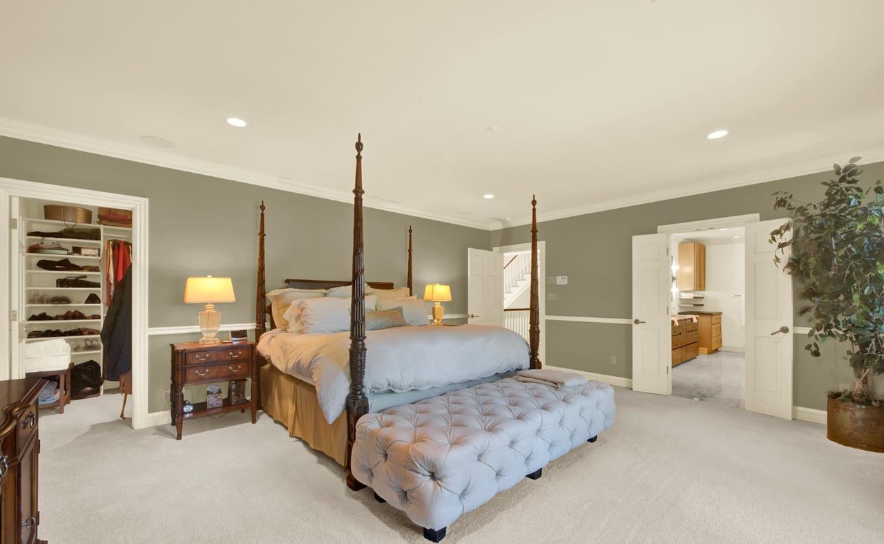 A sophisticated primary bedroom suite featuring a striking four-poster mahogany bed anchored by sage green walls with white wainscoting and crown molding, creating a formal yet inviting transitional aesthetic. The space is enhanced by warm brass lighting, quality furnishings, and thoughtful ensuite connections, delivering classic New England elegance with contemporary comfort.