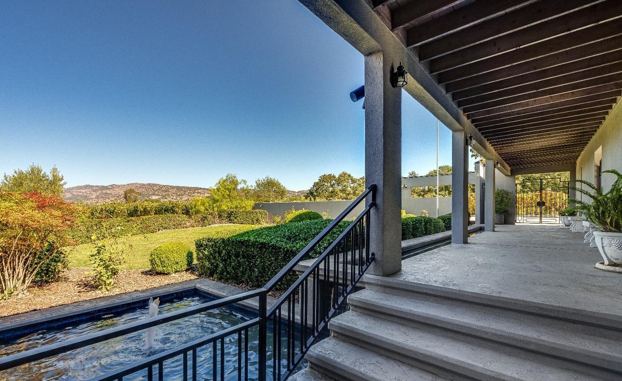 A sophisticated desert modern covered patio featuring a slatted wood ceiling, polished concrete flooring, and an elegant water channel with black metal railing that overlooks rolling hillside gardens. The space seamlessly integrates indoor-outdoor living with clean lines, natural materials, and abundant natural light while maintaining a serene, minimalist aesthetic.