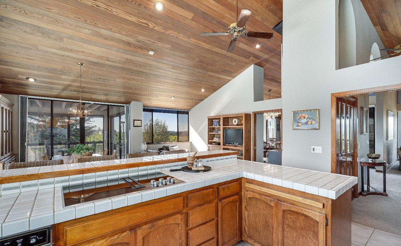 This expansive open-concept kitchen showcases sophisticated transitional design with premium materials: a dual-island layout features marble countertops with brass hardware, complemented by warm natural wood cabinetry and a dramatic wood-plank vaulted ceiling. Floor-to-ceiling glass walls flood the space with abundant natural light while maintaining an airy, serene ambiance that balances contemporary elegance with organic warmth.