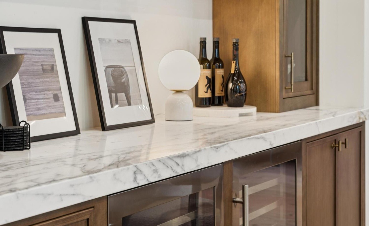 A sophisticated transitional kitchen featuring a marble waterfall island with warm wood cabinetry and brass hardware accents, complemented by curated styling with wine bottles, framed art, and a sculptural statement pendant light. The space balances refined elegance with organic warmth through material choices and minimalist styling.