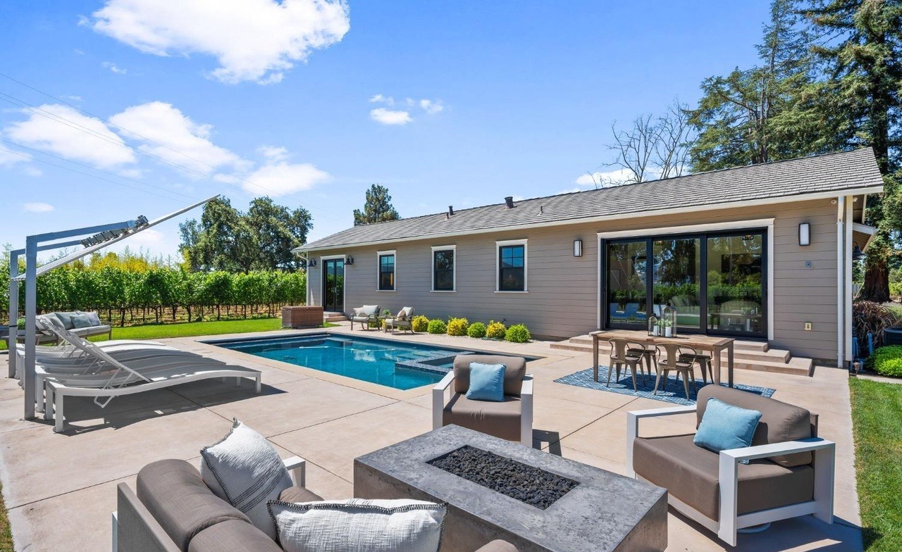 A sophisticated modern pool and patio area featuring a rectangular saltwater pool, integrated fire pit lounge, and streamlined pool house with floor-to-ceiling glass doors overlooking manicured vineyards. The design balances warm contemporary furnishings with cool tones, creating a refined outdoor sanctuary perfect for entertaining.