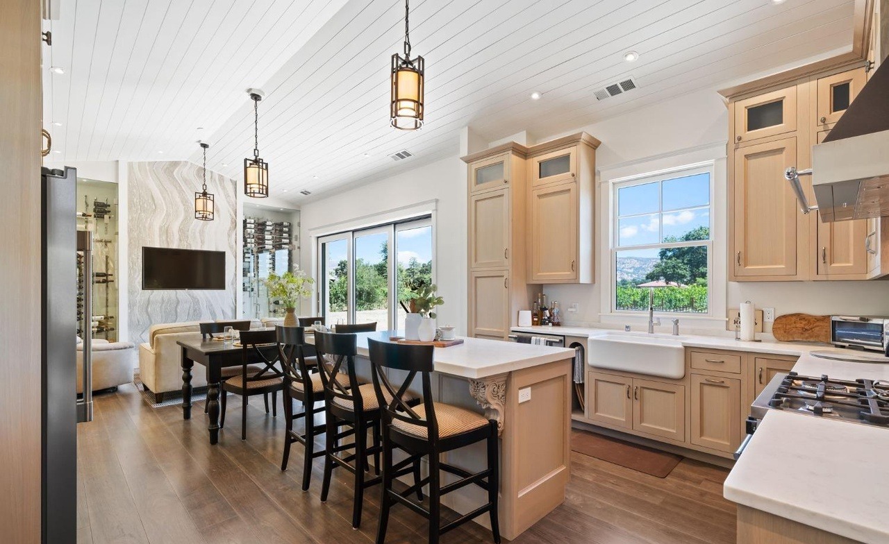 This sophisticated open-concept kitchen features warm natural wood cabinetry with a white shiplap ceiling and abundant natural light from expansive windows overlooking the landscape. The design seamlessly blends transitional elements—crown molding and custom millwork—with organic modern warmth through natural materials, brass hardware, and a waterfall-edge island, creating a luxurious yet inviting family gathering space.