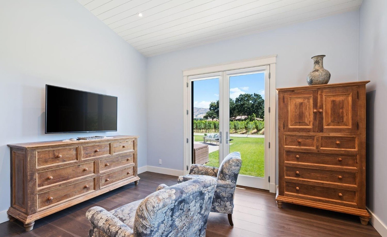 A sophisticated transitional family room featuring warm honey-toned wood furnishings, soft blue upholstered seating, and abundant natural light from floor-to-ceiling French doors that frame vineyard views. The space combines traditional wood cabinetry and classical furniture forms with clean modern lines and a contemporary wood-plank ceiling, creating an effortlessly elegant retreat.