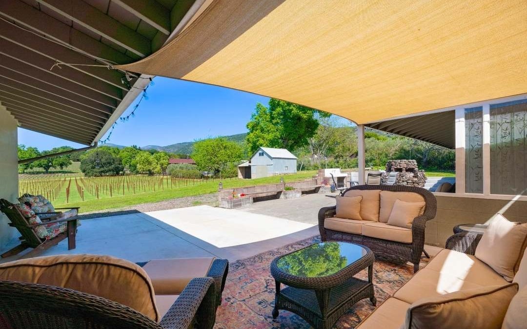 A sophisticated covered patio overlooking vineyard and mountain vistas, featuring layered outdoor living with wicker seating, retractable shade cloth, and a fire pit area. The design seamlessly blends indoor-outdoor living with warm earth tones, natural materials, and abundant natural light, creating an inviting retreat for entertaining or relaxation.