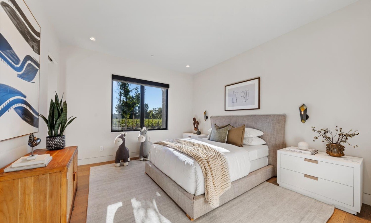 A serene primary bedroom featuring a neutral palette of whites, beiges, and grays accented with warm gold and blue tones, anchored by a sophisticated upholstered headboard and complemented by a curated mix of natural wood and white furnishings. Floor-to-ceiling windows flood the space with abundant natural light, creating an airy, spa-like sanctuary with professional styling and high-end finishes.