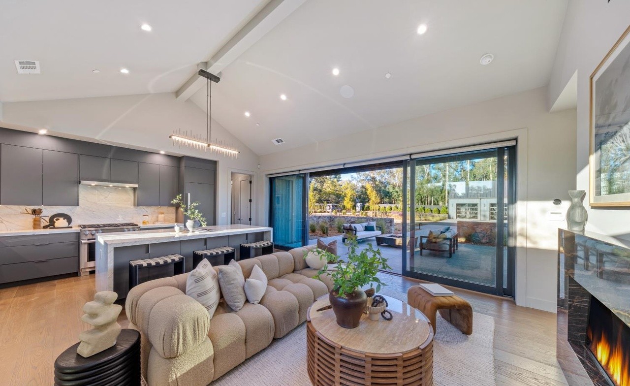 A stunning open-concept living and kitchen space featuring a curvaceous sculptural sofa, sophisticated gray cabinetry with a stone slab backsplash, and expansive floor-to-ceiling windows framing manicured outdoor views. The room exemplifies organic modern design through warm natural materials, neutral tones, and seamless indoor-outdoor integration, anchored by an active fireplace and sophisticated pendant lighting.