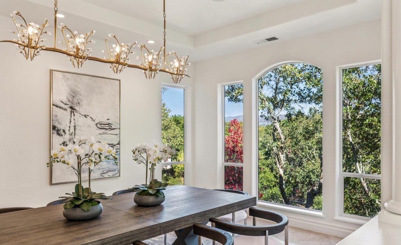 A sophisticated home office featuring a sculptural wooden desk overlooking expansive landscape views through floor-to-ceiling windows, anchored by an elegant brass branch chandelier and warmed by natural wood flooring and potted orchids. The serene, light-filled space balances minimalist furnishings with organic materials and refined detailing, creating an inspiring workspace with refined luxury.