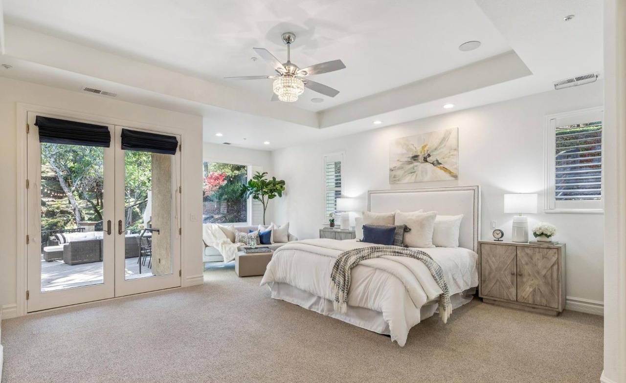 An exceptionally elegant primary bedroom suite featuring a tray ceiling with chandelier, abundant natural light from floor-to-ceiling doors opening to a patio, and a sophisticated neutral palette anchored by creams, taupes, and soft grays with navy and gold accents. The room exemplifies transitional luxury with traditional millwork details paired with contemporary furnishings and a seamless indoor-outdoor connection.