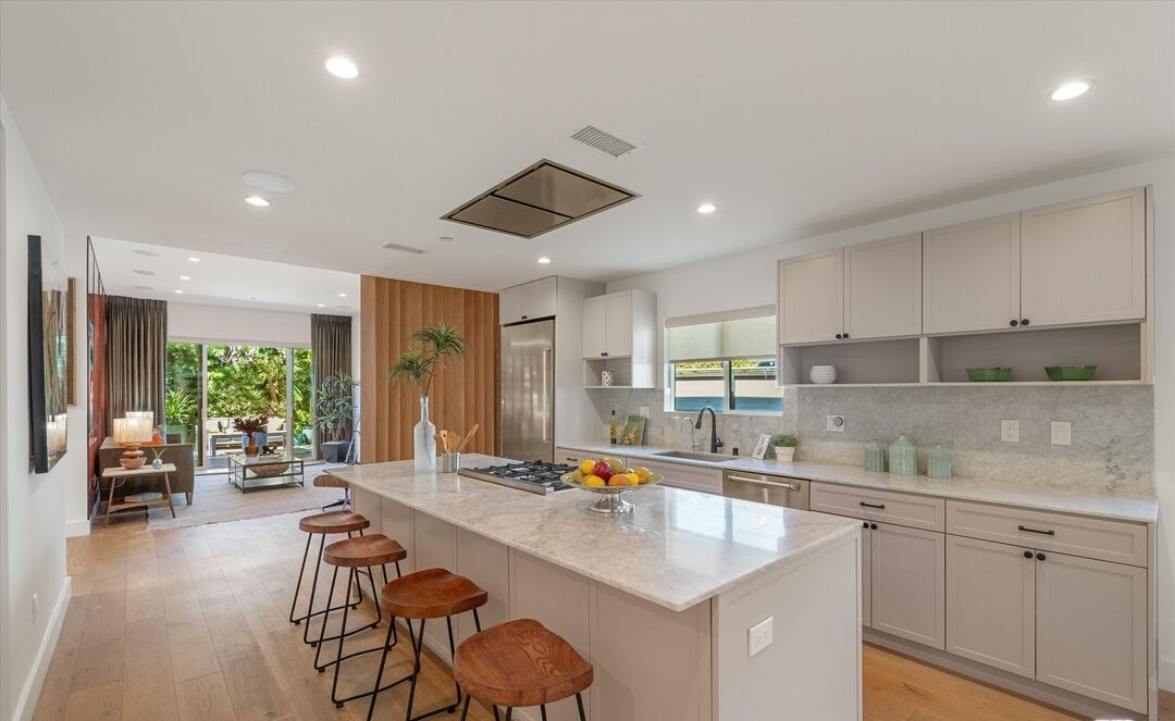 A sophisticated open-concept kitchen featuring a marble waterfall island, soft white cabinetry, and warm wood accents that create an inviting yet polished aesthetic. The abundant natural light, high ceilings, and seamless flow into the adjacent living area exemplify contemporary luxury design with organic warmth.