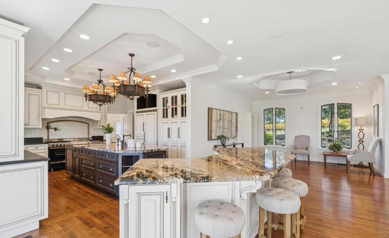 This expansive transitional kitchen features a sophisticated two-island layout with waterfall granite countertops, coffered ceilings with recessed lighting, and a seamless blend of creamy white and dark wood cabinetry. The space exemplifies upscale luxury through its attention to detail, high-end finishes, and open-concept flow into an adjoining living area with floor-to-ceiling windows.