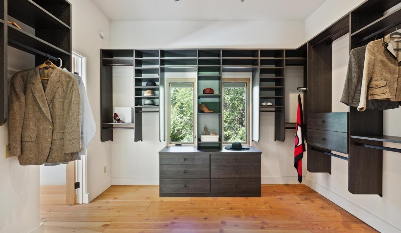 A sophisticated walk-in closet featuring custom dark wood cabinetry and extensive built-in shelving with a central island dresser, bathed in natural light from floor-to-ceiling windows overlooking greenery. The minimalist black-and-white palette with warm wood accents and thoughtful storage solutions creates an editorial-quality dressing room that functions as both practical and luxurious.