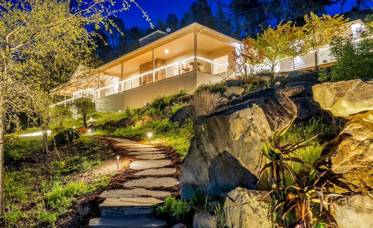 A stunning mountain-modern covered patio with expansive floor-to-ceiling windows overlooking a dramatic natural stone landscape and forest backdrop, featuring warm ambient lighting that highlights the architectural clean lines and seamless indoor-outdoor integration at twilight. The design combines organic natural materials—exposed stone walls, timber beams, and stone pavers—with contemporary minimalist architecture and thoughtful landscape illumination to create an elevated outdoor living sanctuary.