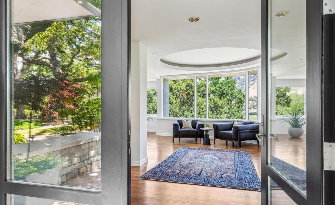 A sophisticated modern living room featuring a striking curved dome ceiling and expansive floor-to-ceiling windows that frame verdant landscape views, creating seamless indoor-outdoor flow. The space balances architectural drama with understated elegance through neutral wall tones, warm hardwood flooring, and carefully curated navy upholstered furniture, enhanced by potted greenery and a layered Persian rug.