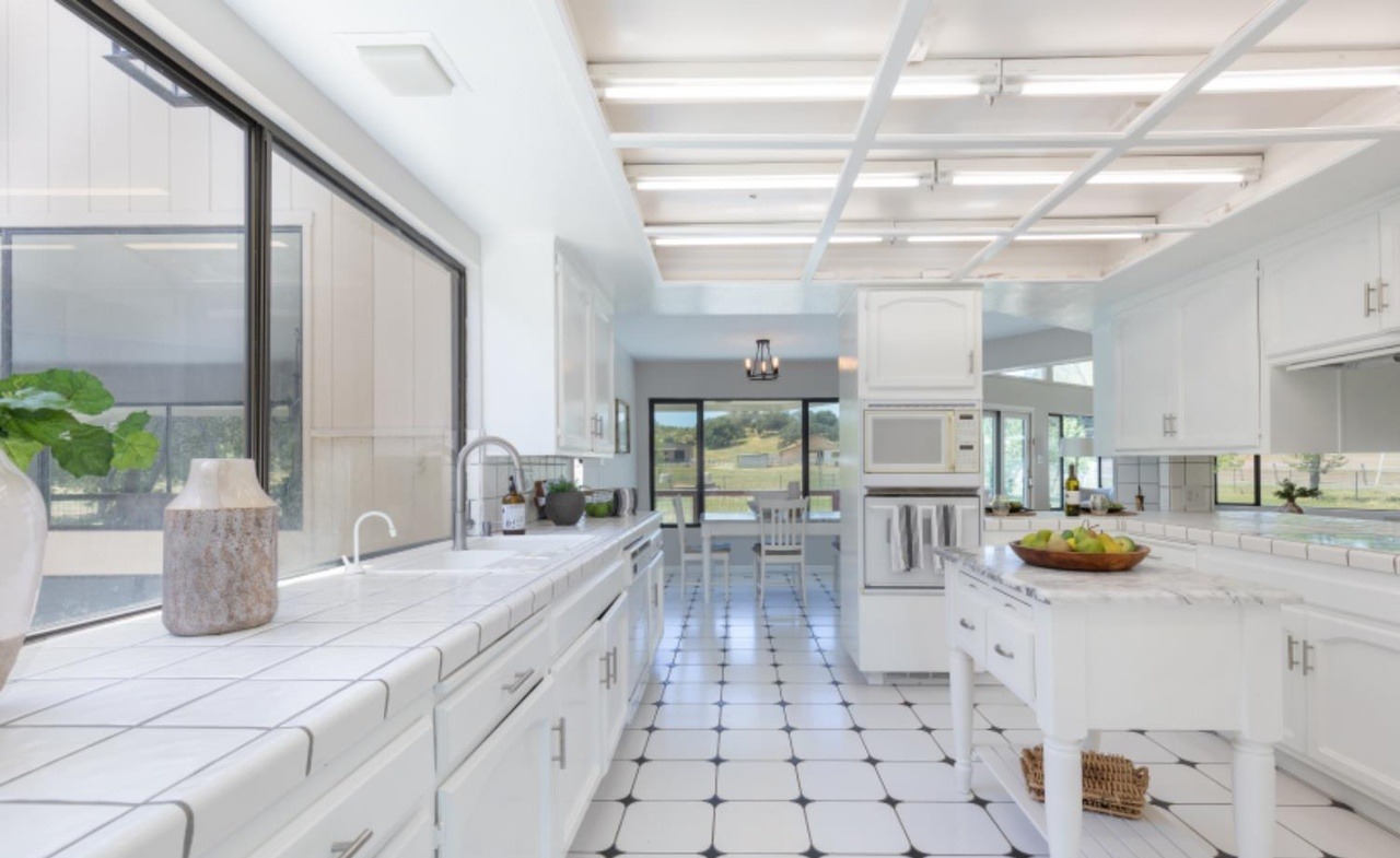 Countertop: QuartzCabinets: White ShakerCabinet Color: WhiteFlooring: TileBacksplash: Subway TileCeiling: Coffered