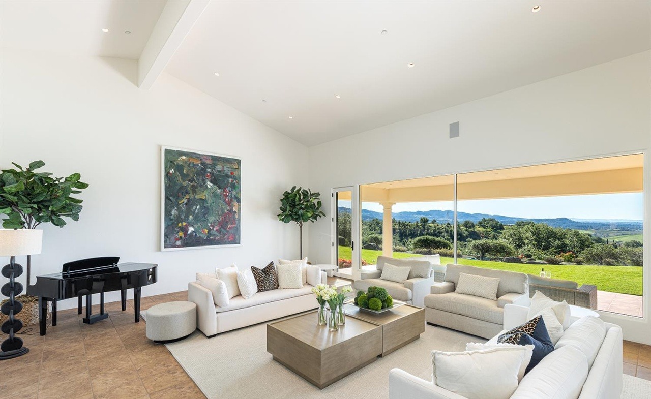 A spectacular modern living room with expansive floor-to-ceiling windows framing breathtaking pastoral and mountain views, featuring a sophisticated palette of creams, light wood, and warm neutrals anchored by a streamlined sectional arrangement and natural cork flooring. The space exemplifies organic modern luxury through high ceilings, abundant natural light, and carefully curated minimalist furnishings that prioritize the dramatic landscape backdrop.