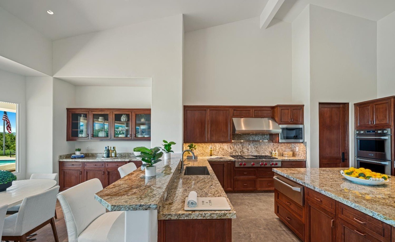 A sophisticated high-end kitchen featuring rich cherry wood cabinetry paired with warm granite countertops and a dramatic stone backsplash, anchored by a striking waterfall-edge island that defines the open-concept space. Vaulted ceilings and abundant natural light create an airy, grand atmosphere while maintaining a warm, inviting aesthetic through traditional materials elevated with contemporary refinement.