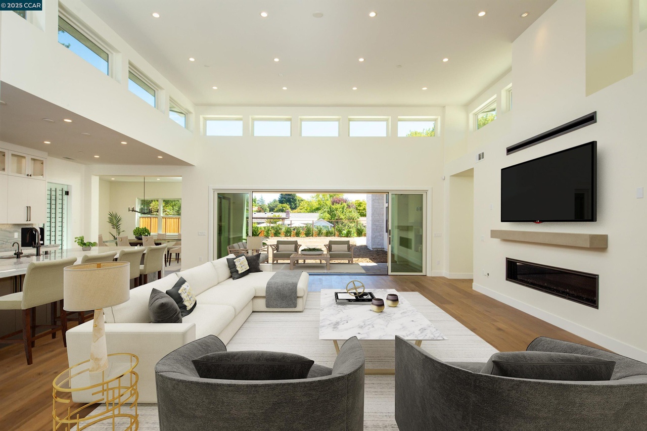 An expansive, light-filled family room featuring soaring skylighted ceilings, floor-to-ceiling glass doors opening to a resort-style patio, and seamless integration of indoor-outdoor living. The sophisticated design combines warm wood flooring, custom white millwork, and neutral furnishings accented with charcoal seating and a linear fireplace, creating a refined yet livable luxury space.