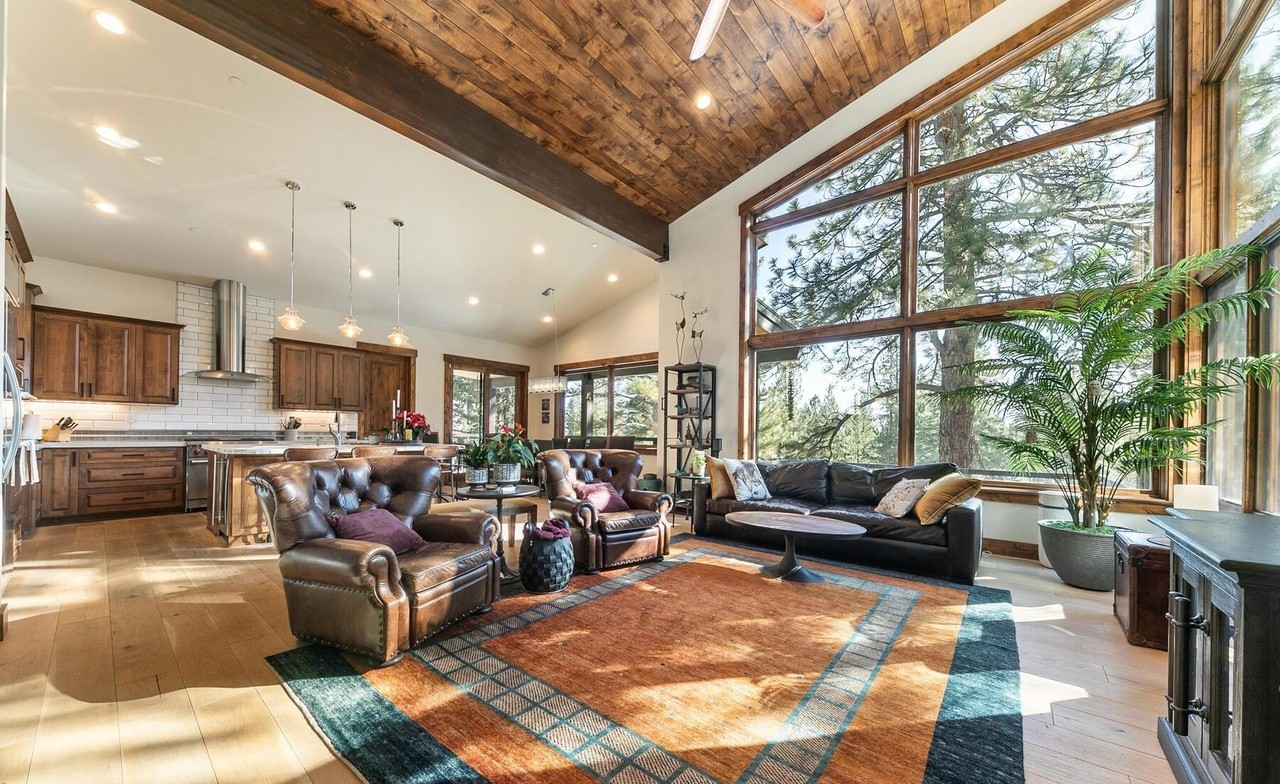 A stunning open-concept great room seamlessly blending kitchen and living spaces, anchored by dramatic exposed timber beams and expansive floor-to-ceiling windows that flood the space with natural light. The sophisticated design pairs rich dark wood cabinetry with warm leather furnishings, geometric area rugs in rust and teal, and polished brass fixtures, creating a luxurious yet inviting atmosphere perfect for both entertaining and relaxation.