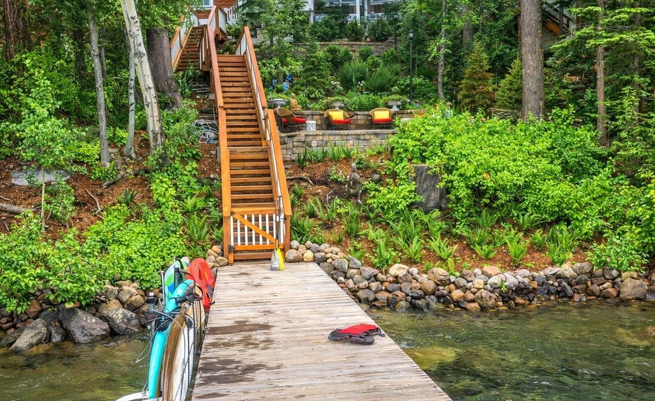 A stunning lakefront patio featuring a dramatic wooden staircase leading from a stone-accented upper terrace to a waterfront deck, surrounded by lush mature trees and thoughtfully designed landscaping. The space seamlessly blends outdoor living with natural beauty through warm wood materials, stone elements, and a central fire pit area, creating an inviting retreat with abundant natural light and serene water access.