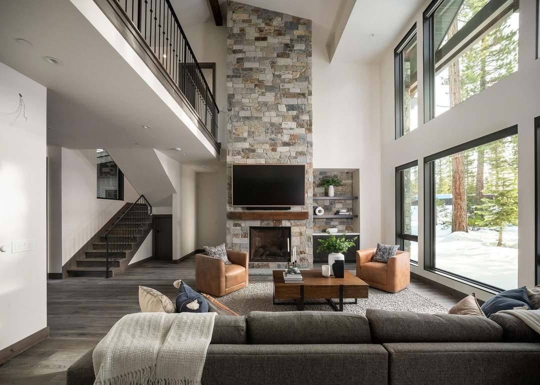 A soaring, light-filled great room featuring a dramatic double-height stone chimney breast anchoring the space, paired with extensive floor-to-ceiling glass walls that frame forest views. The warm-neutral palette—softened by cognac leather chairs, textured gray linen sectional, and rich hardwood flooring—creates sophisticated comfort enhanced by subtle modern architectural details and integrated built-in shelving.