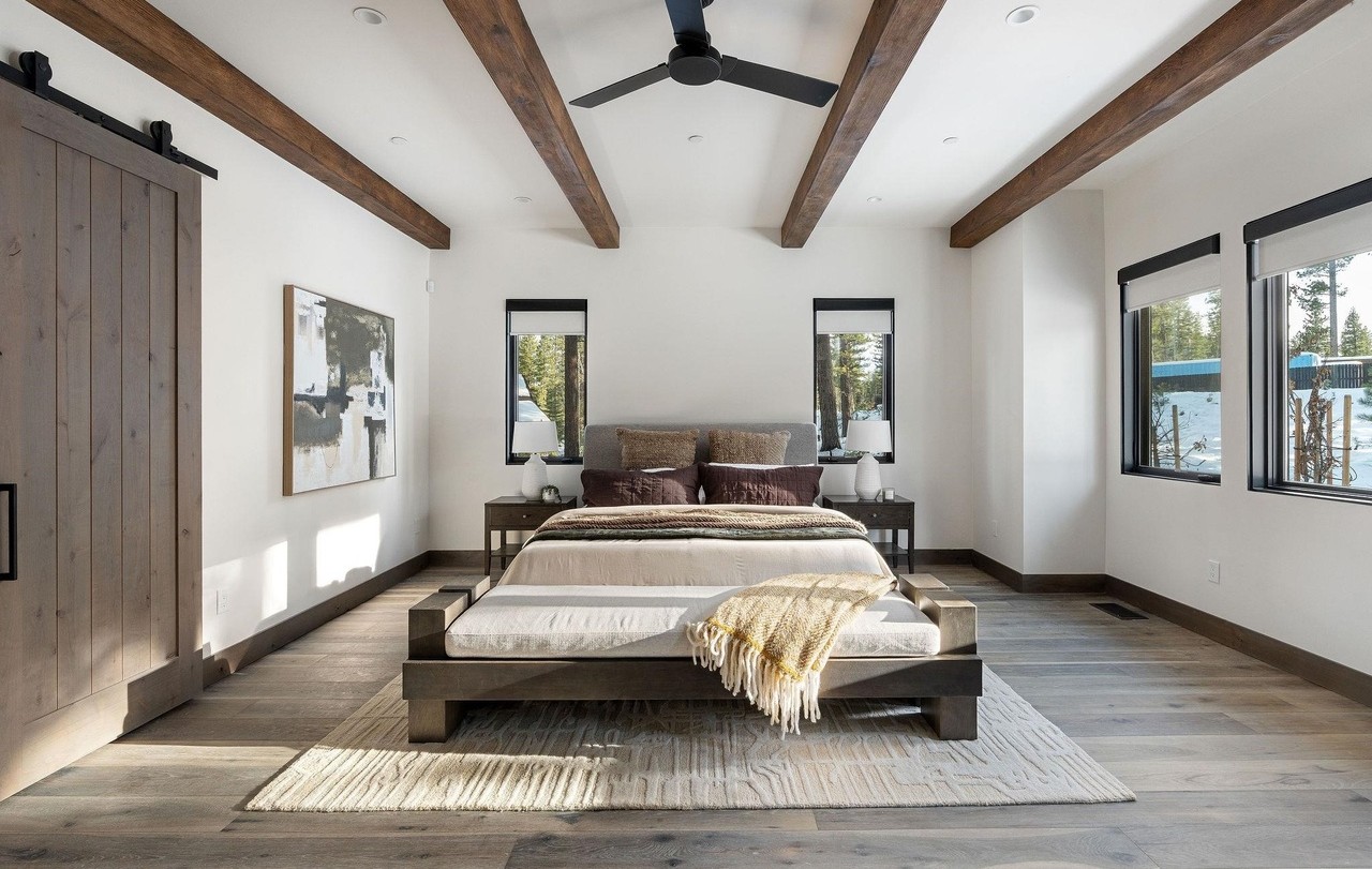 A stunning mountain modern primary bedroom featuring dramatic exposed timber beams and abundant natural light from floor-to-ceiling windows framing forest and water views. The warm wood-and-white palette, paired with a low-profile solid wood bed and neutral linens accented with gold textiles, creates a serene yet sophisticated retreat that seamlessly blends rustic architectural elements with contemporary comfort.