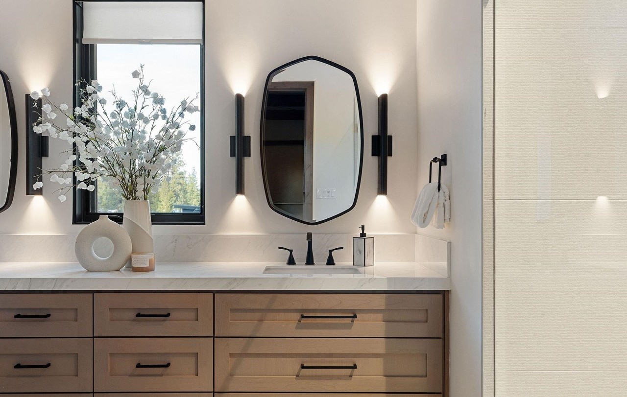 A serene, spa-like primary bathroom featuring a sophisticated marble countertop vanity with light wood cabinetry and black hardware accents. Large arched black-framed mirror with flanking sconce lighting creates an elevated, gallery-like aesthetic, while abundant natural light from the window and thoughtful material pairings deliver a warm, luxurious retreat.