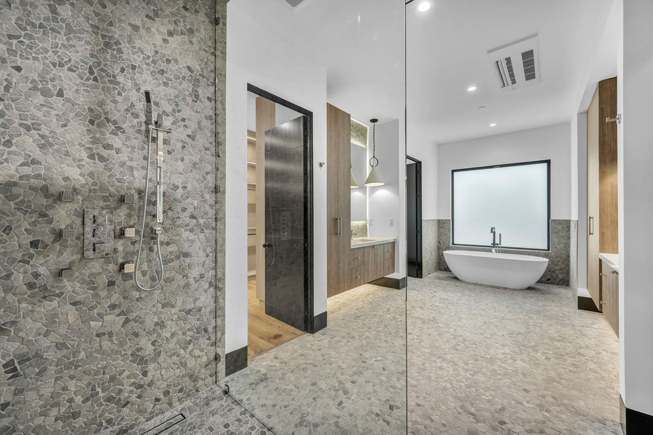 Freestanding TubWalk In ShowerFrameless Glass EnclosureFloating VanityDouble VanityLarge Format WindowPendant LightingStatement LightingBuilt In ShelvingSkylight