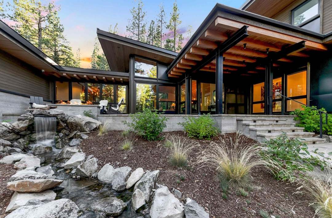 A stunning mountain-modern patio with soaring timber-beam pergola, floor-to-ceiling black-frame glazing, and seamless indoor-outdoor integration. The space features a cascading water feature, naturalistic landscaping with ornamental grasses, and warm mixed materials (wood, concrete, stone) creating a serene yet sophisticated high-altitude retreat.