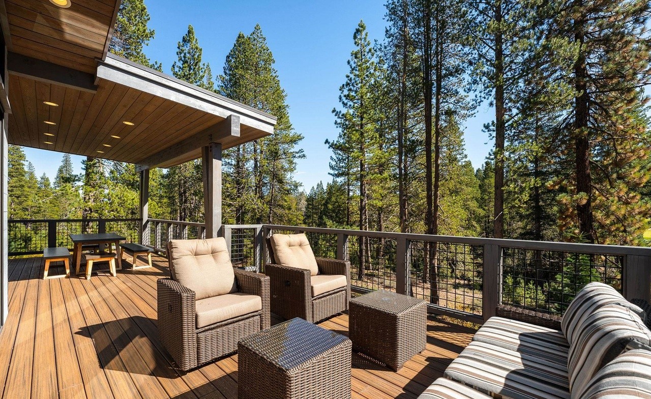A sophisticated mountain modern patio seamlessly blends indoor-outdoor living with a dramatic wood-planked pergola, comfortable woven rattan seating with cream cushions, and sleek black metal railings overlooking pristine forest views. The warm material palette and thoughtful lighting create an inviting retreat that prioritizes natural beauty and contemporary elegance.